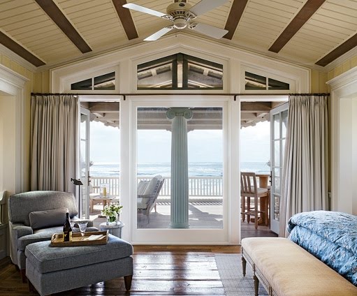 Designed entirely by architect Robert A. M. Stern Architects, the home features bedrooms on the lower level, and more common living spaces upwards. This would allow for spectacular ocean and town views. The home has several terraces that are designed more like rooms, where the family occupies most. It's obvious the architect was thinking upwards because every ceiling is also dressed to perfection. From trim to panels to paint, there is no surface left untreated. The full story was featured in Architectural Digest, April 2008, and more photos can be viewed online at Robert A M Stern Architects.